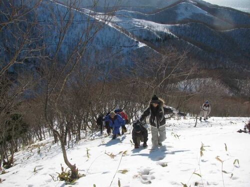 明けましておめでとうございます! N42°の会、新年恒例、「里山歩き」、寒風の中、楽しかったです。行き先は、えりも小学校の校歌にも歌われている「三角山」でした。 途中までは林道、最後はササ原を直登しました。もちろん、みなさん長靴での参加!雪は…