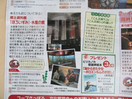 えりも町郷土資料館「ほろいずみ」・水産の館が、コープ宅配システムトドックの「暮らし便利プレス」2月号に紹介されました。 ピリカノカ襟裳岬絵本「海から来た少女」のプレゼントもあります。 絵本の著者「すずき・もも」さんの個展が開催されています。 1…