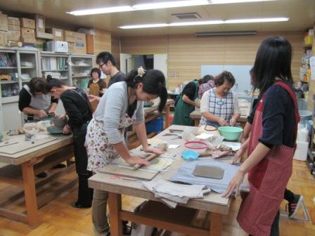 2012-10-23 体験陶芸教室始まりました。 体験陶芸教室 平成24年度第2期体験陶芸教室が始まりました。 午前の部・夜の部合わせて16名が参加しています。成形、削り、色づけの3回で作品を作ります。 さて、どのような作品ができるでしょうか?楽しみです。