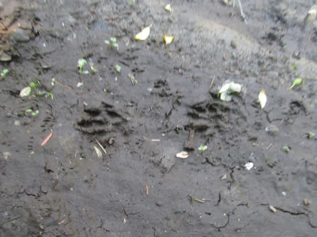 2017-06-15 アライグマ~親子だ! フットパス いてほしくないアライグマの足跡、それも子連れだ! えりも町内です!! えりも町役場ではアライグマの駆除を行っていますが、平成28年度は7頭の駆除、今年度は現在のところ2頭だということでした。 (中岡利泰)